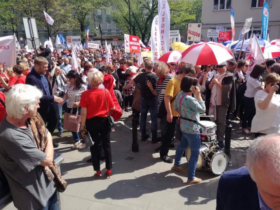 Ponad 5 tysięcy manifestantów - nauczycieli, rodziców i samorządowców - domagało się pod Ministerstwem Edukacji Narodowej godnych wynagrodzeń oraz dymisji Minister Edukacji Narodowej Anny Zalewskiej, która zdaniem protestujących szkodzi polskiej edukacji.